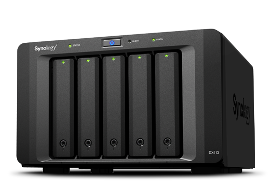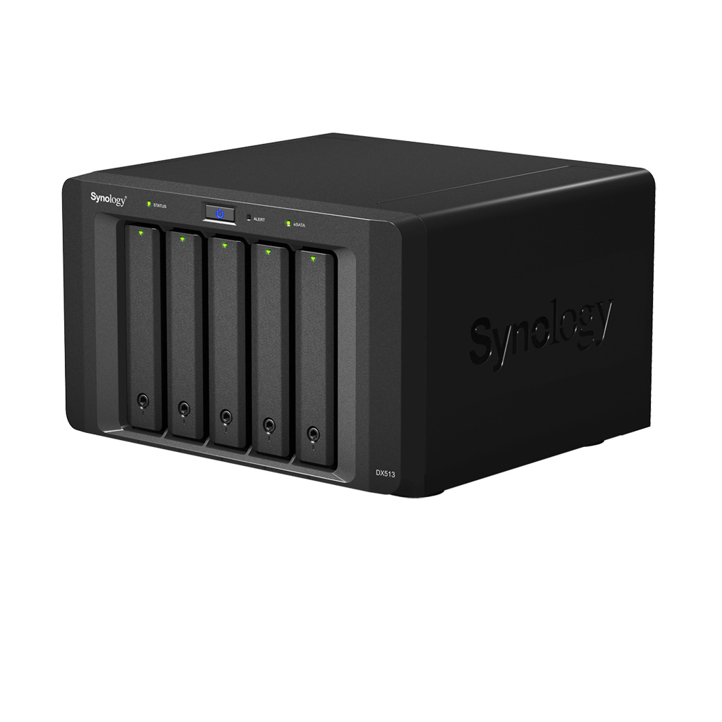 Synology® DX513 delivers an effortless solution for volume expansion and data backup for selected Synology DiskStation models. The DX513 seamlessly scales up the storage capacity of the DiskStation by additional 5 hard drives on-the-fly when connected directly to an expansion cable.